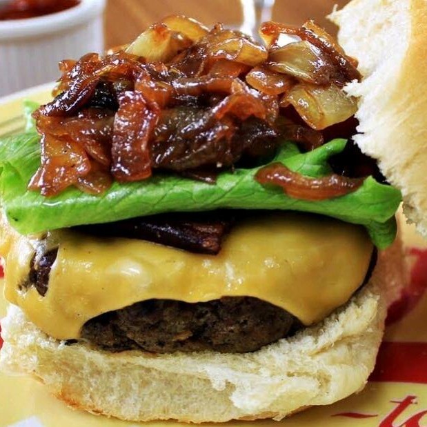 Pão,carne artesanal 130 gramas,queijo mussarela,cebola Caramelizada,tomate e alface.