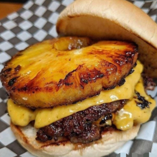 Pão gergelim, carne 130g , abacaxi grelhado, queijo mussarela, molho cheddar