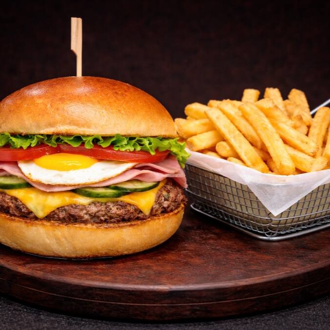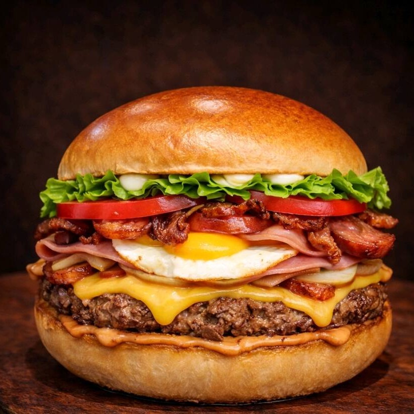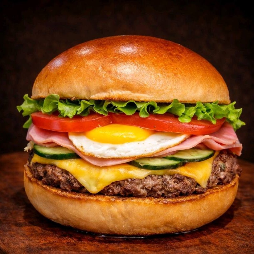Hambúrguer no pão macio com carne suculenta, ovo, presunto, queijo derretido, tomate, pepino e alface.