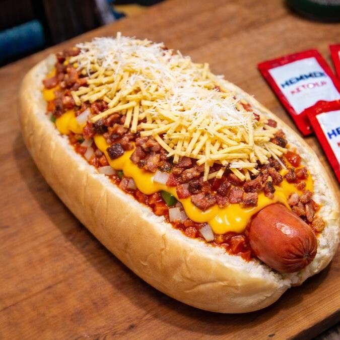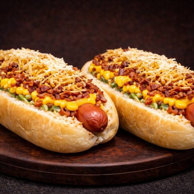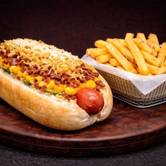 Hot dog no pão macio com salsicha, molho especial, vinagrete, cheddar cremoso, bacon crocante, batata palha e queijo ralado.