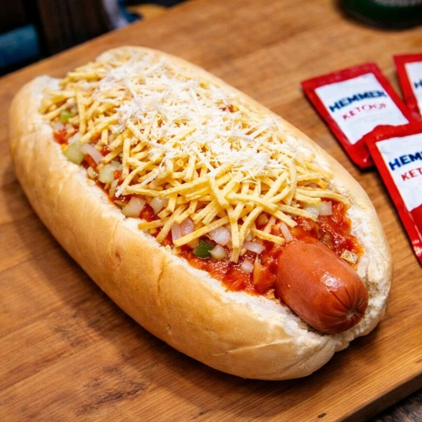 Hot dog tradicional no pão macio com salsicha, molho especial, vinagrete, batata palha crocante e queijo ralado.