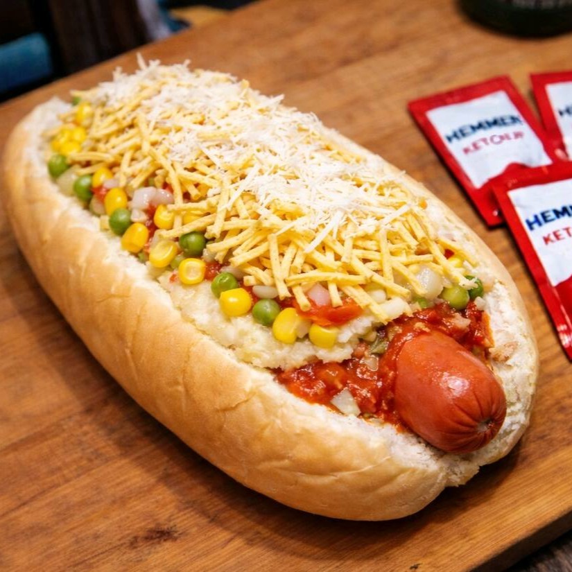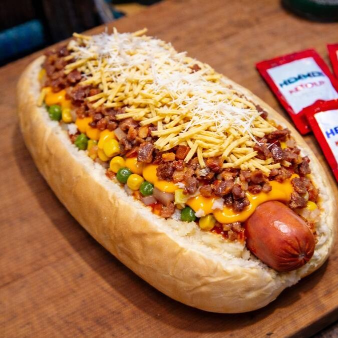 Hot dog no pão macio com salsicha, molho especial, vinagrete, purê de batata cremoso, milho, ervilha, batata palha crocante e queijo ralado.