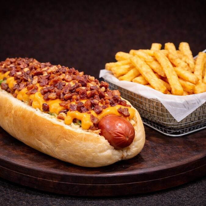 Hot dog no pão macio com salsicha, cheddar cremoso e bacon crocante acompanhado de batata frita crocante.