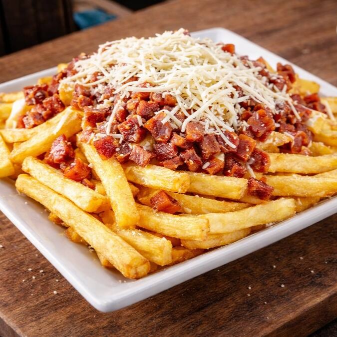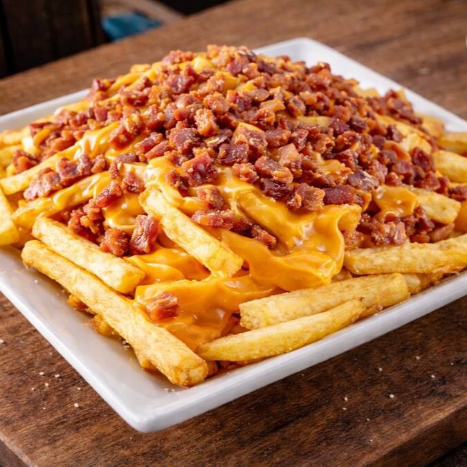 Batata frita crocante, coberta com cheddar cremoso e bacon crocante