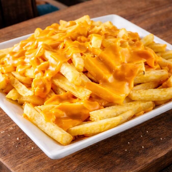 Porção de batata frita crocante coberta com delicioso cheddar cremoso. Perfeita para acompanhar seu lanche.