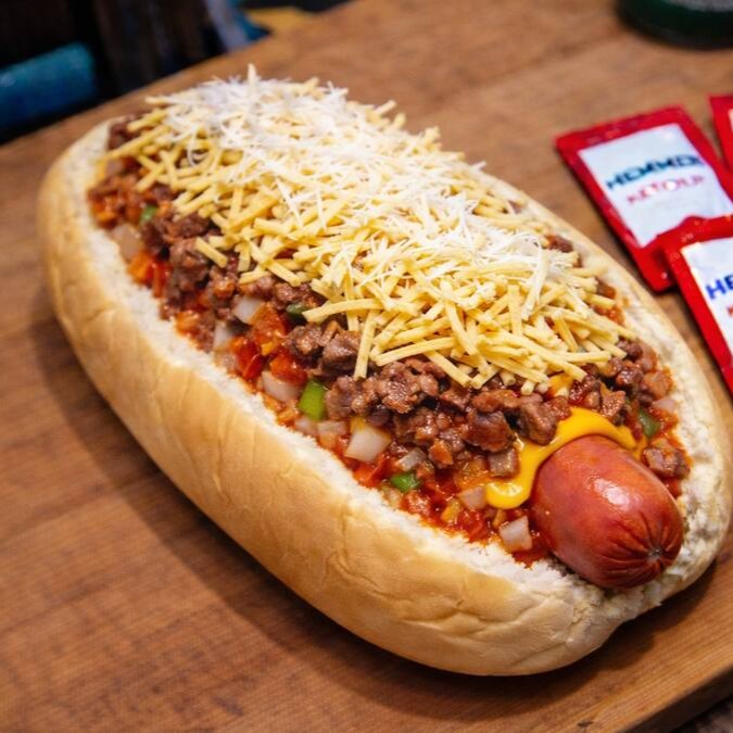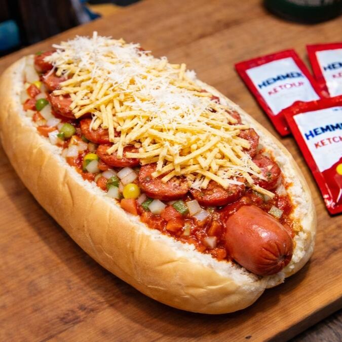 Hot dog no pão macio com salsicha, molho especial, picadinho de carne, vinagrete, batata palha crocante e queijo ralado.