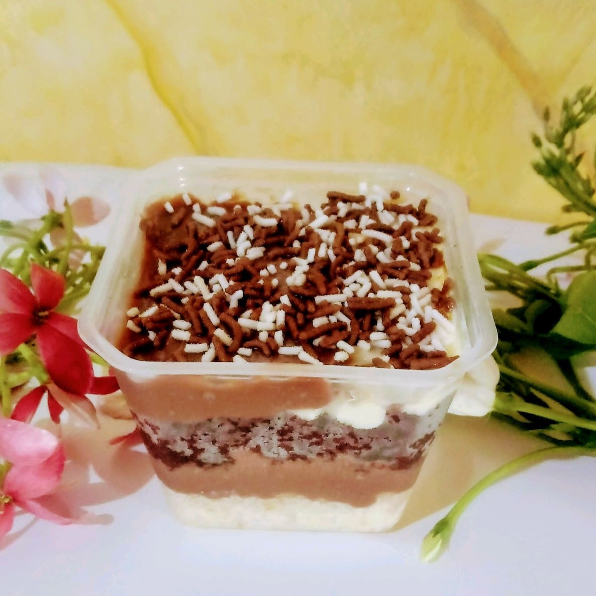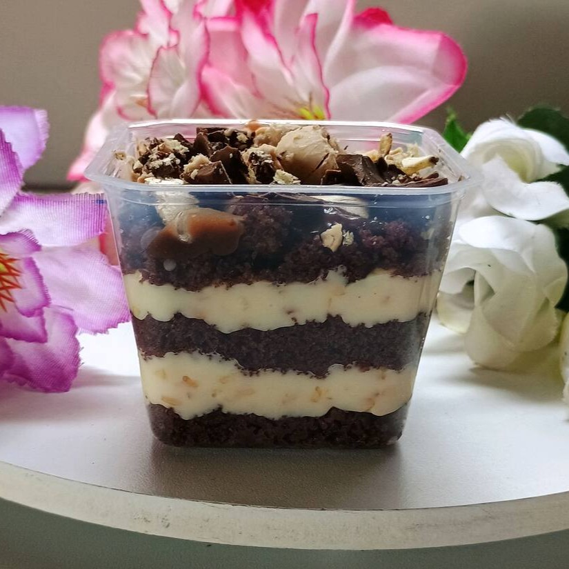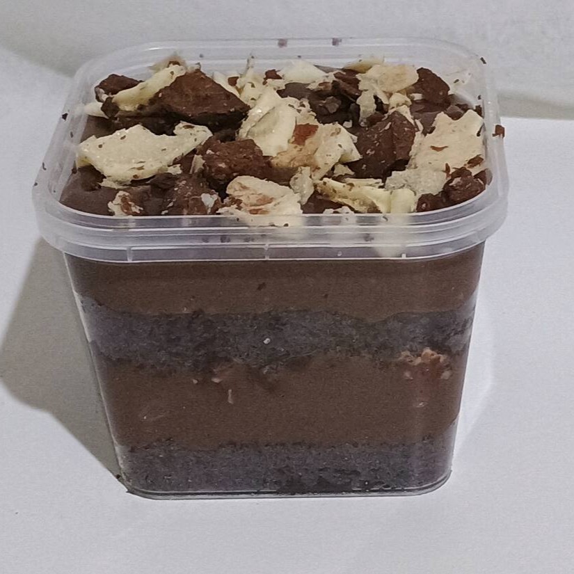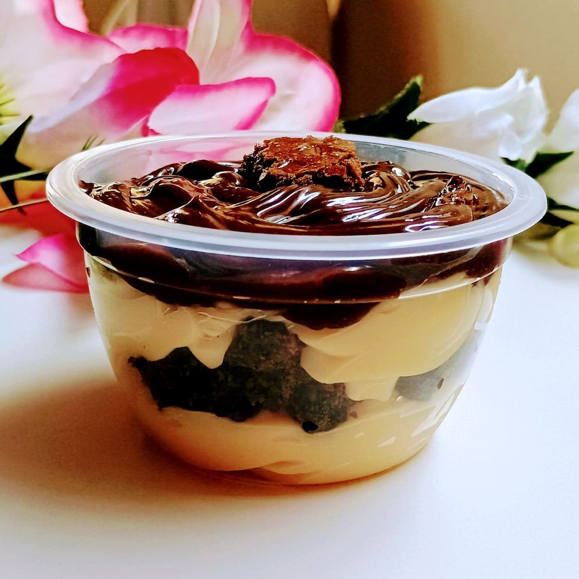 Um pote delicioso com uma camada de brigadeiro cremoso de leite Ninho com brownie brigadeiro de chocolate cremoso serve uma pessoa