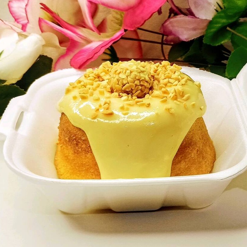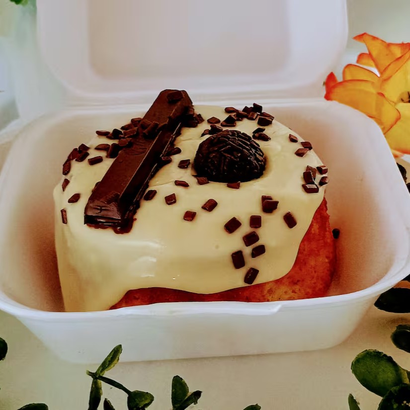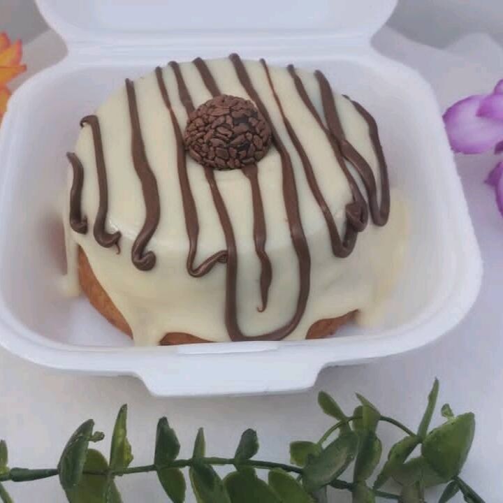 Um mini bolinho de massa branca fofinho com brigadeiro de leite Ninho cremoso serve 1 pessoa pesar em média 250g