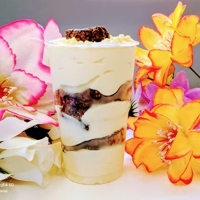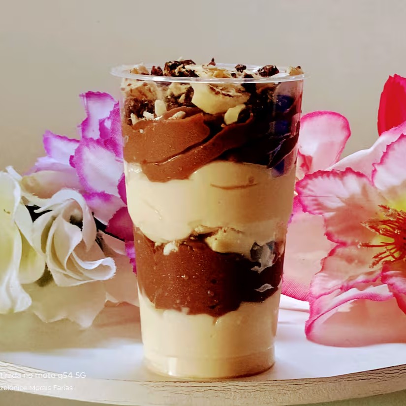 Um delicioso copo de creme de cupuaçu tripla camada de creme e uma dupla camada de brownie simplesmente maravilhoso granulado de chocolate branco por cima serve uma pessoa 275g
