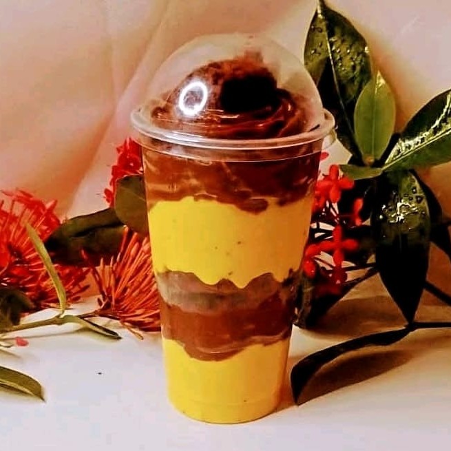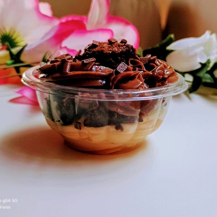 Um delicioso copo da felicidades creme de maracujá com Brownie e creme de chocolate serve 1 pessoa prox370g