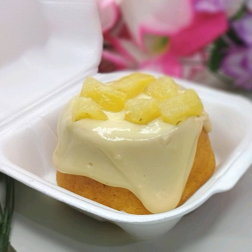 Um bolinho de massa branca bem fofinha e cobertura de brigadeiro branco cremoso com toque especial de abacaxi serve 1 pessoa pesar em média 250g