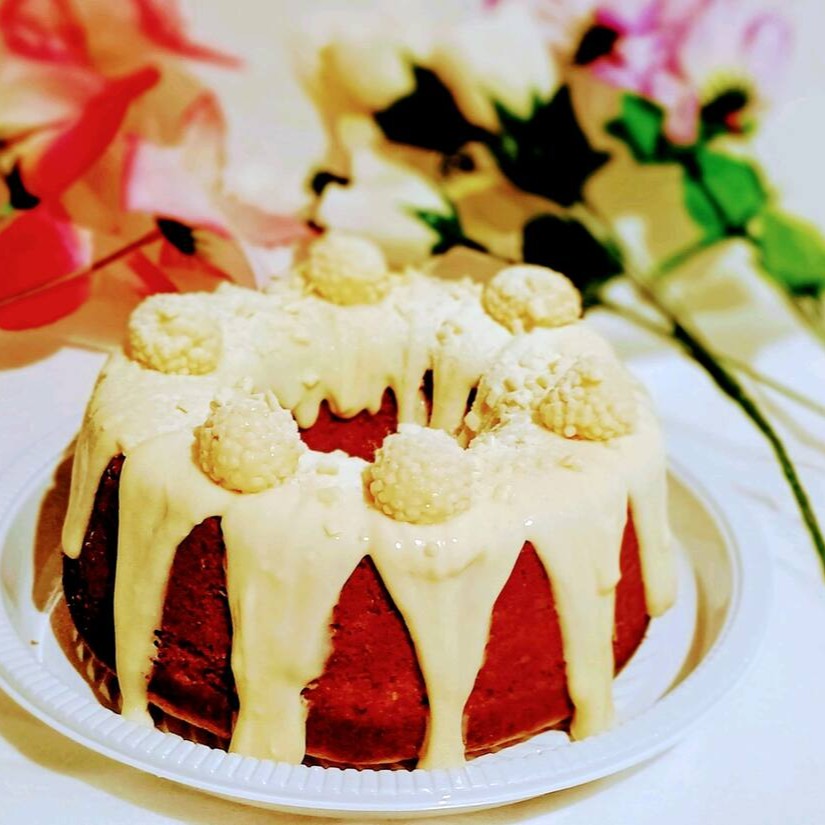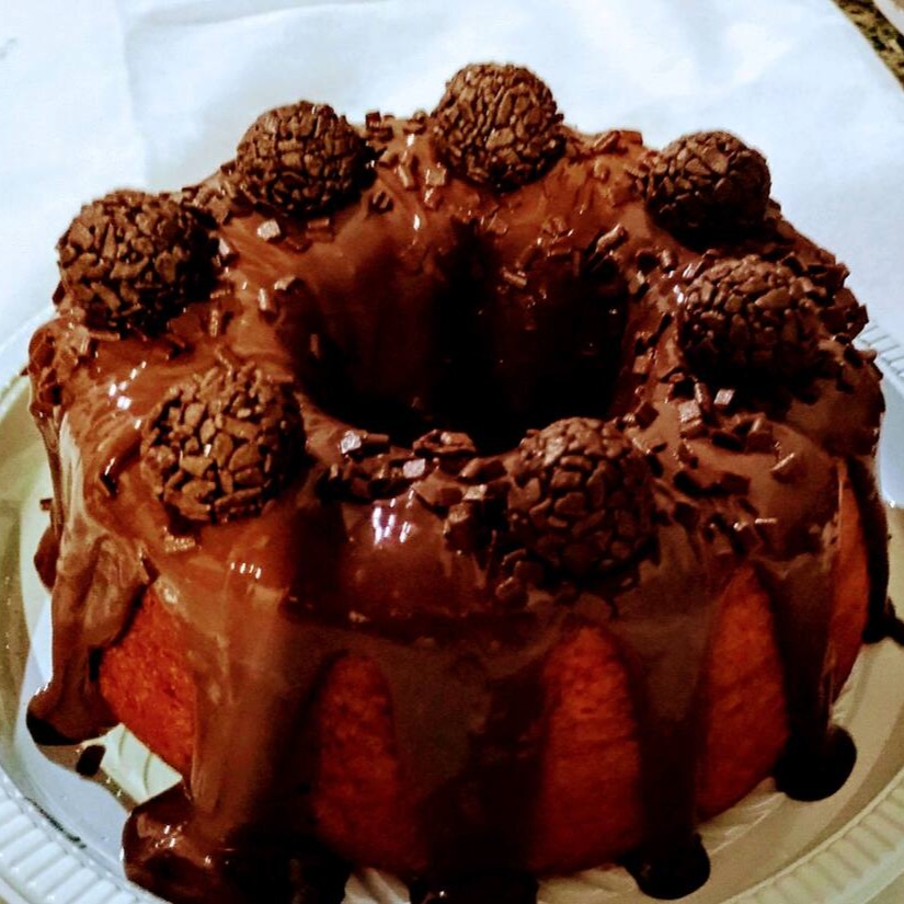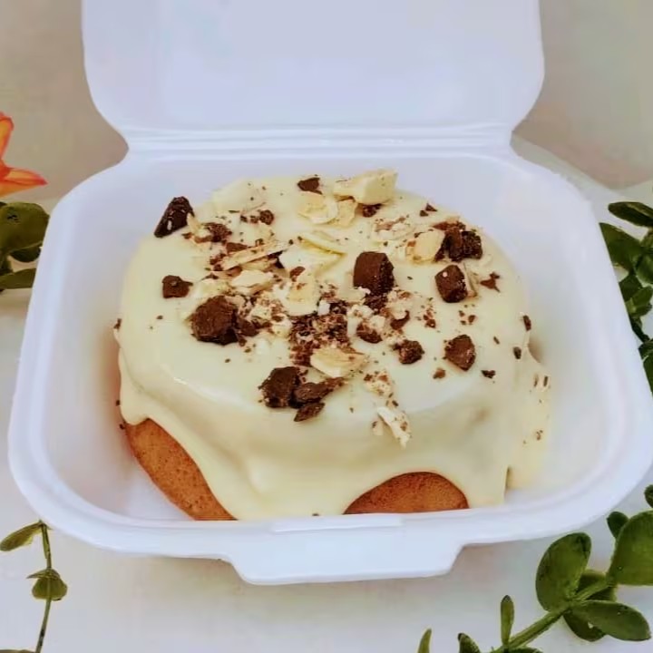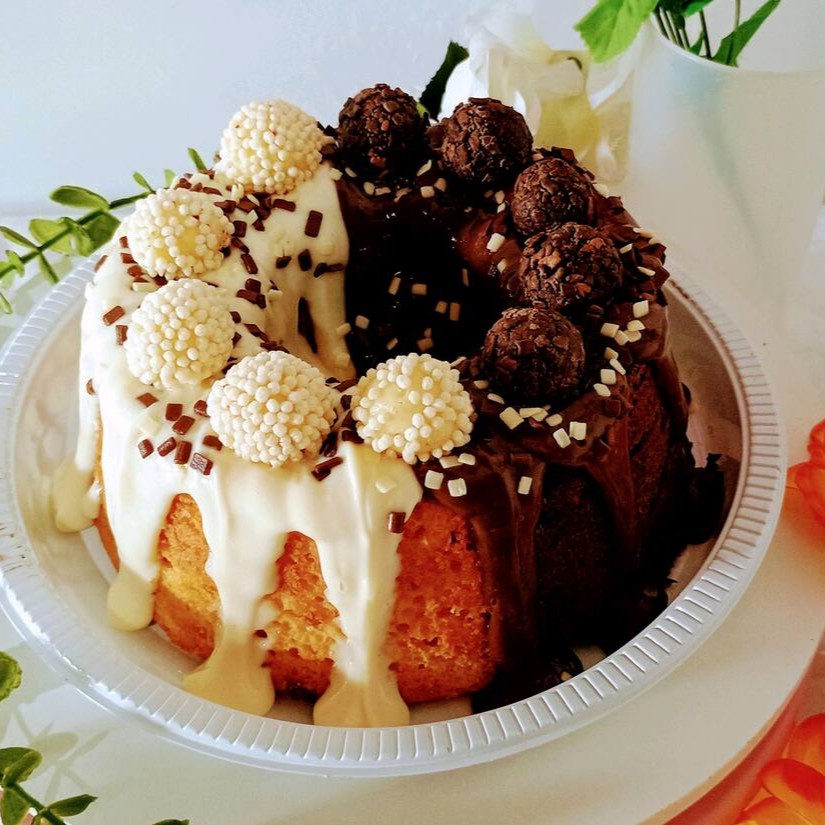 Um bolo de Massa de Branca de baunilha super fofinho uma cobertura brigadeiro de leite Ninho cremosa serve até 4 pessoas