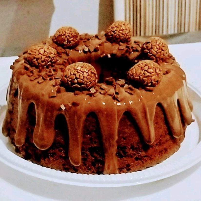 Um bolinho de massa branca com cobertura de brigadeiro de leite Ninho cremoso e bombons Ouro Branco picado por cima