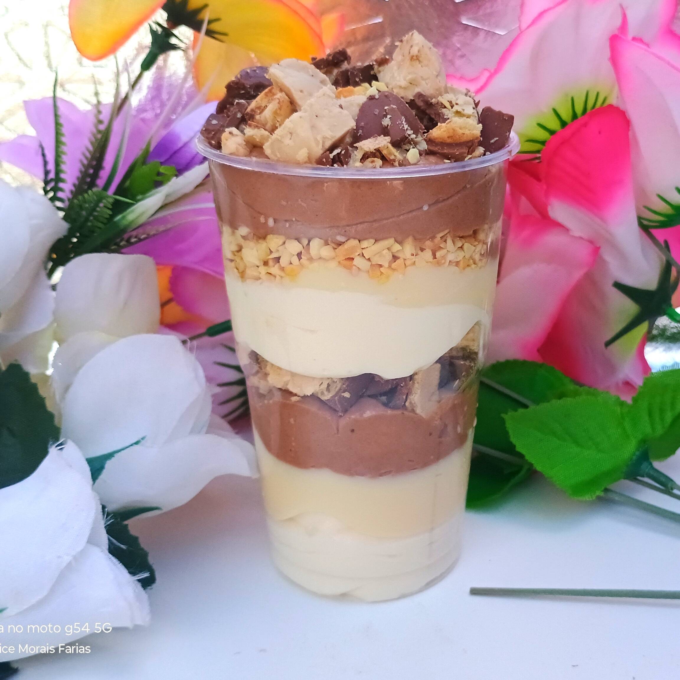 Um delicioso copo com dupla camada de musse de leite Ninho e chocolate entre ela amendoim e bombons Sonho de Valsa a finalização com bombons serve uma pessoa peso médio 255g
