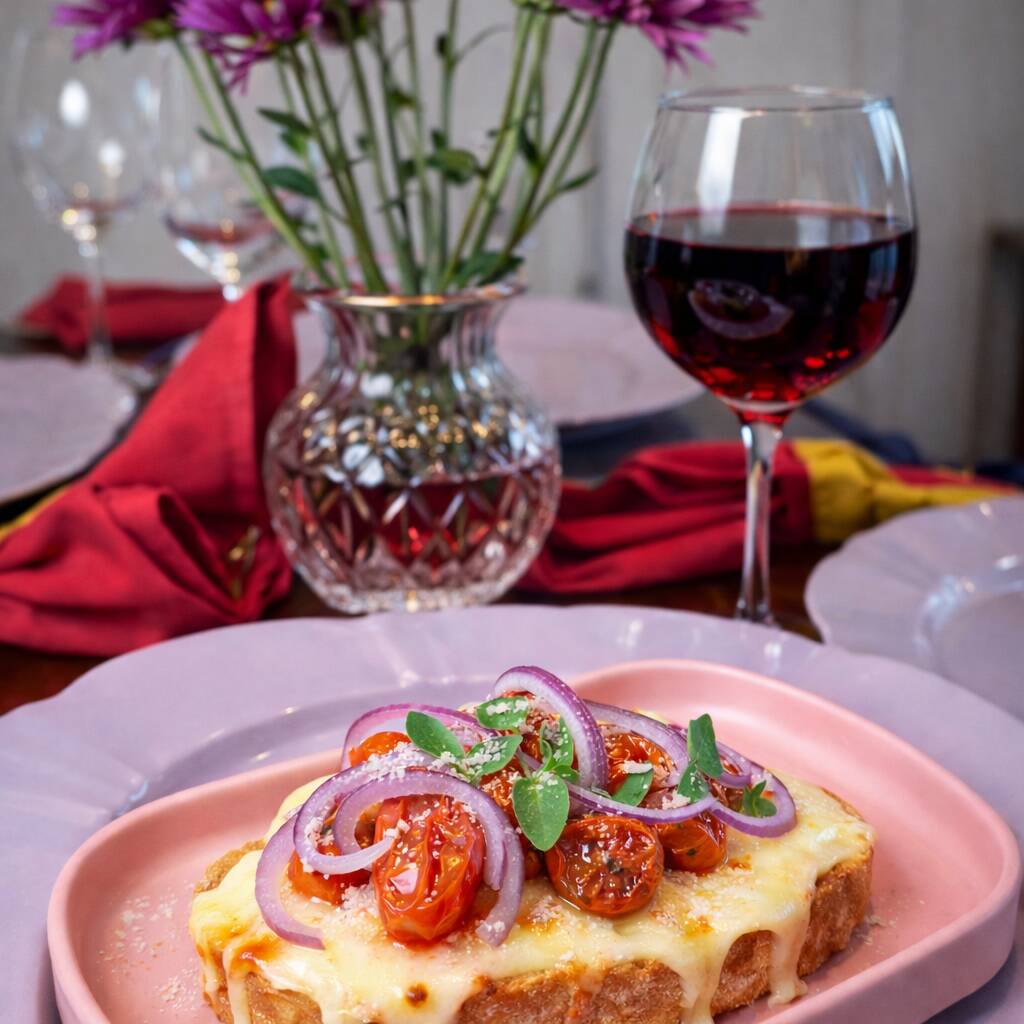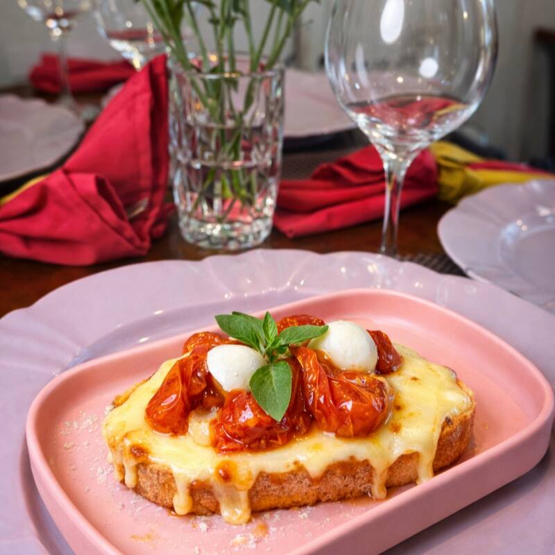 Pão artesanal tostado com queijo muçarela derretido, folhas frescas de rúcula, tomate confitado e finalizado com muçarela de búfala — leve, aromática e cheia de sabor.
