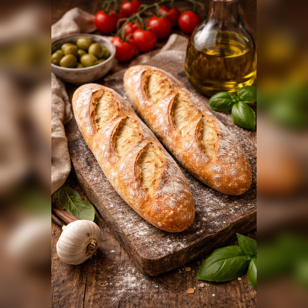 Rústico por fora e macio por dentro — um pão italiano artesanal de 275g, feito com tempo e cuidado para trazer aroma e textura de padaria clássica em cada fatia.