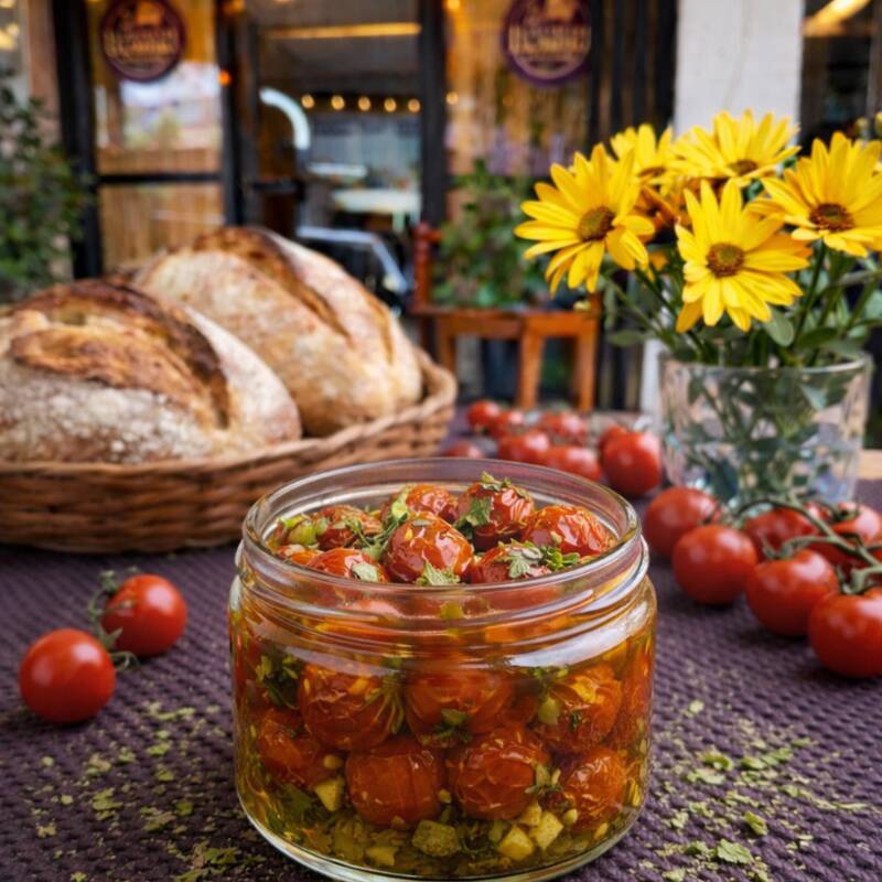 Tomatinhos assados lentamente no azeite com ervas aromáticas, macios e intensamente saborosos — perfeitos para acompanhar pães, torradas e tábuas .