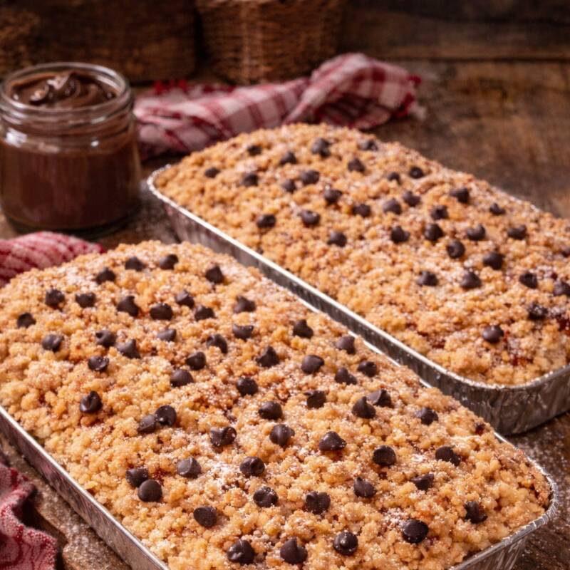 Cuca alemã de massa macia e dourada, recheada com chocolate ao leite cremoso e coberta por farofa crocante amanteigada. Um doce reconfortante, equilibrando a suavidade do chocolate com o toque caseiro clássico.