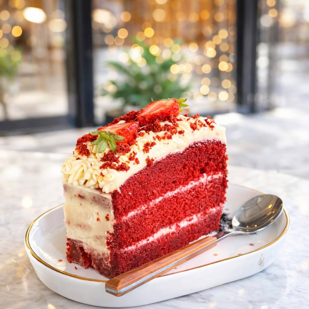 Fatia de Red Velvet 175g, bolo macio e aveludado com leve toque de chocolate, recheado e coberto com creme de cream cheese suave e equilibrado. Uma combinação clássica, delicada e irresistível.