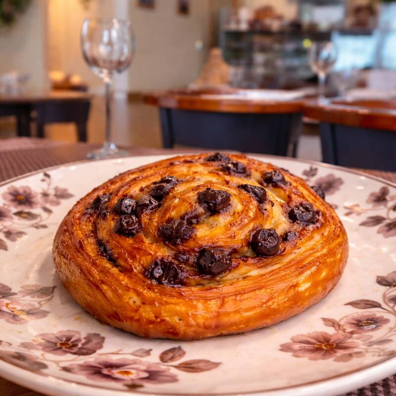 Pain au Raisin (Chocolate) com massa folhada leve e crocante, recheado com chocolate ao leite, creme pâtissier e tiras de coco. Delicado, cremoso e irresistível.