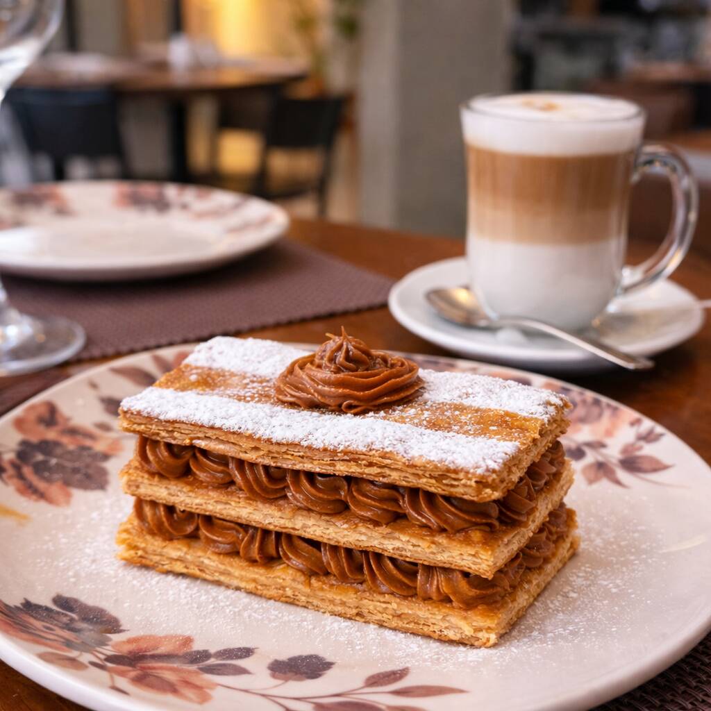 Mille-feuille (Mil-folhas) com camadas crocantes e folhadas, recheio cremoso delicado. Um clássico da confeitaria francesa, leve e irresistível.