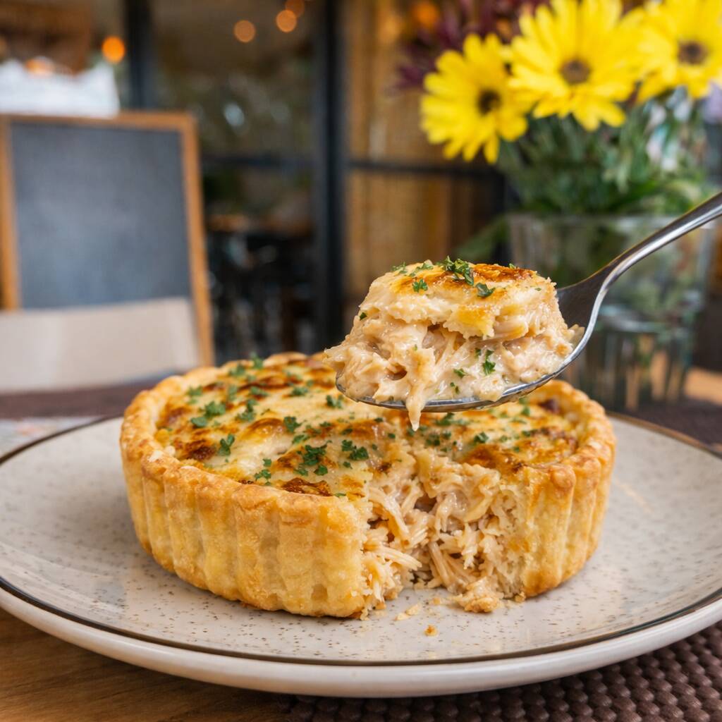 Dourada por fora, cremosa por dentro… nossa quiche de frango é puro conforto em cada garfada. Recheio delicado, bem temperado e envolvido em um creme aveludado que derrete na boca. Difícil é comer só um pedaço.