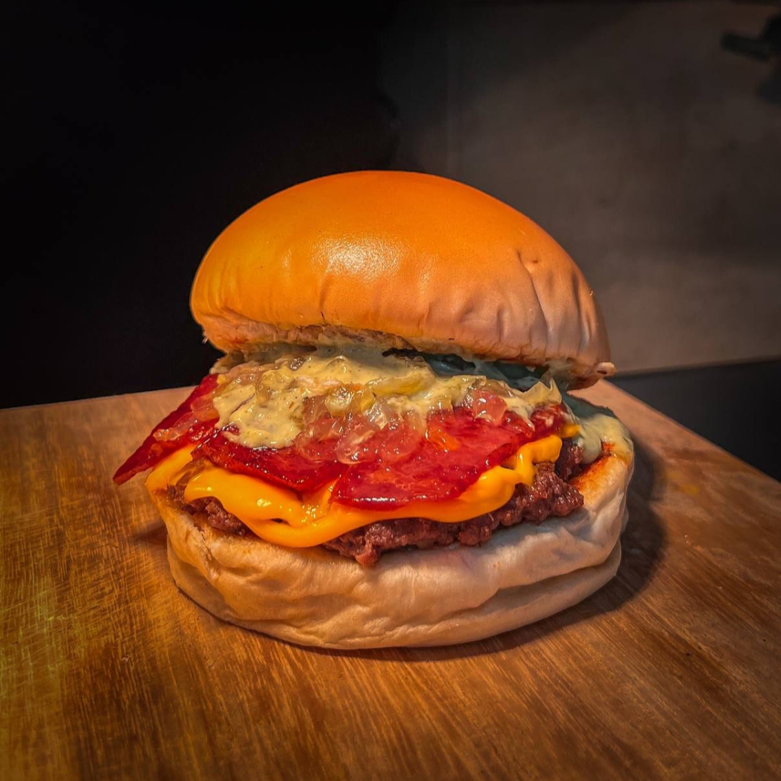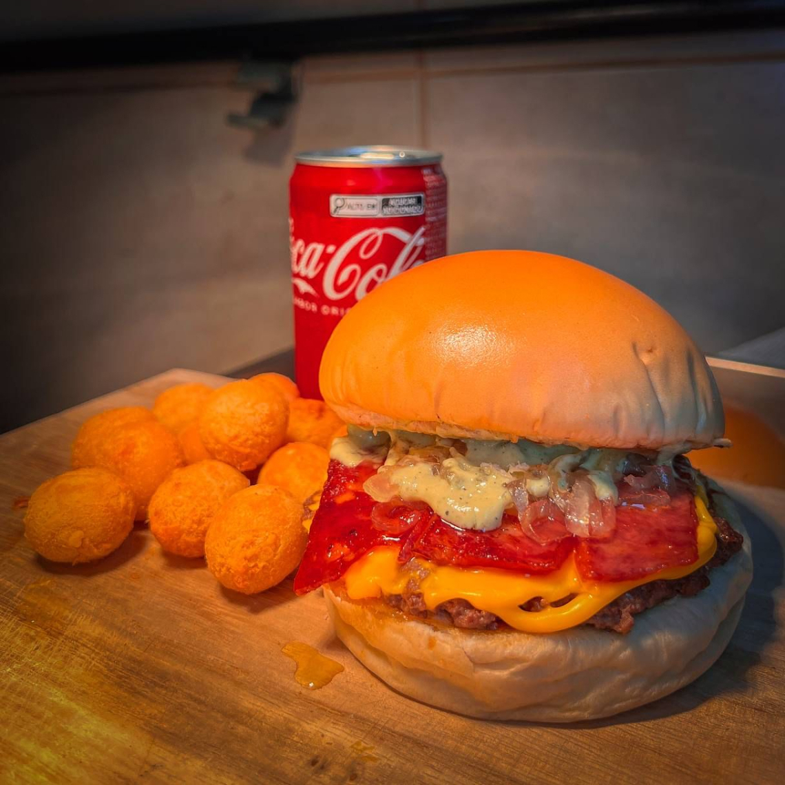 Pão selado, smash 70g, cheddar, calabresa, molho do chef/maionese caseira na tampa do pão, acompanha dois saches de molho.