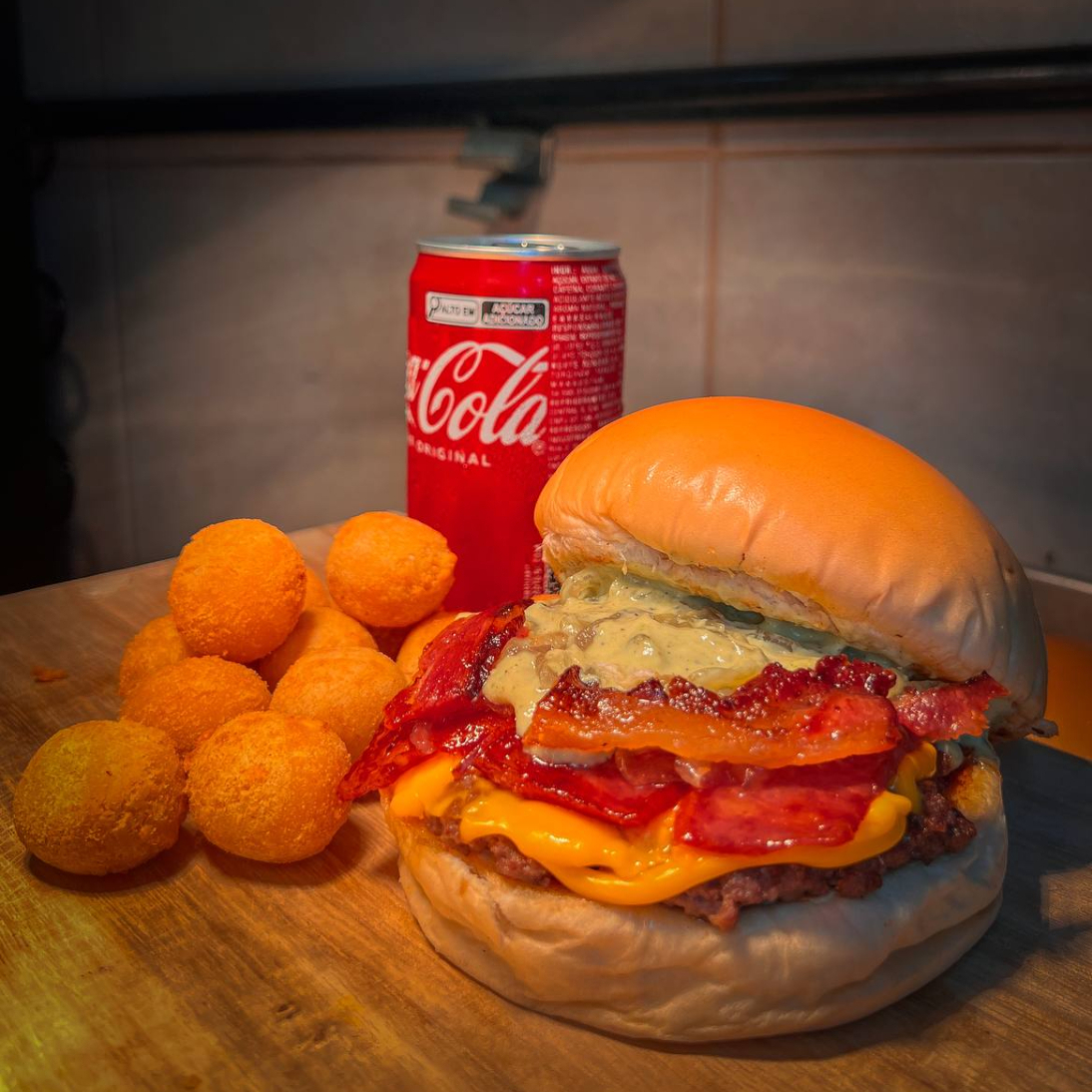 Pão selado, Burguer 140g, cheddar, bacon, molho do chef/maionese caseira na tampa do pão, acompanha dois saches de molho.