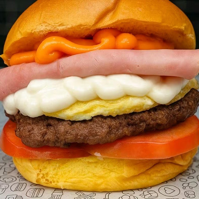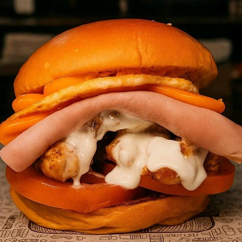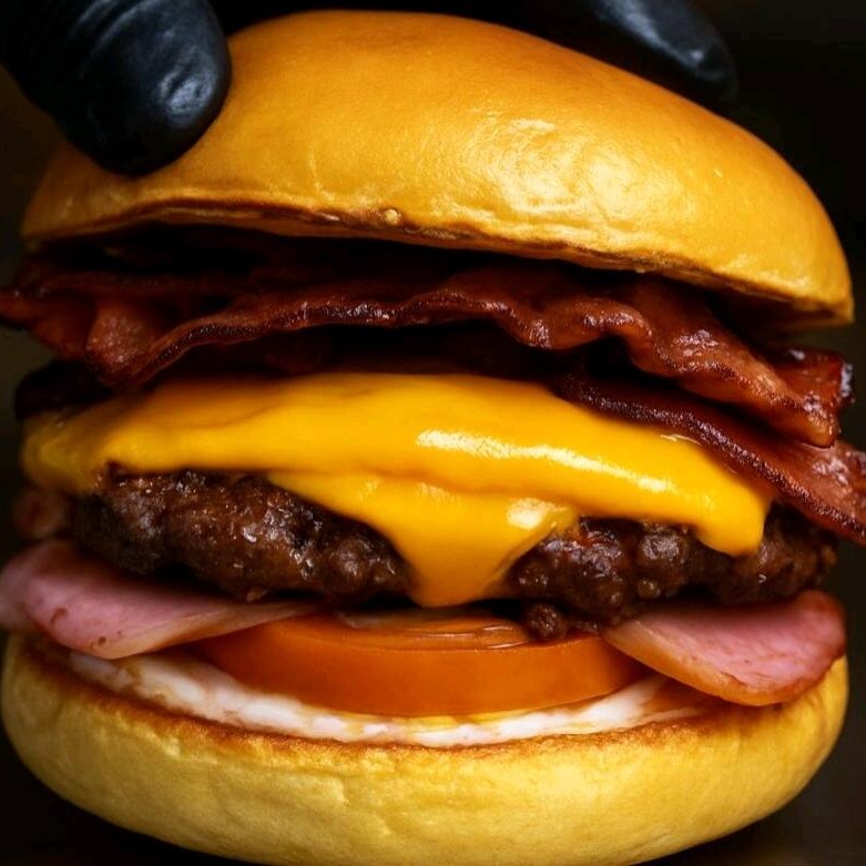 Pão de brioche,carne,bacon,ovo,presunto,queijo cheddar,tomate e molho da casa.