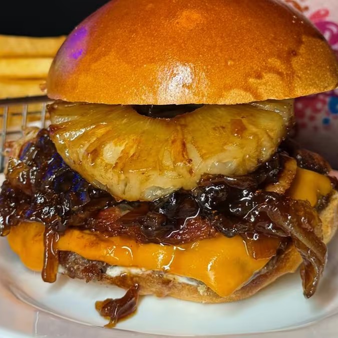 Pão de brioche, uma carne 100g, queijo cheddar fatiado, abacaxi, bacon, cebola caramelizada e molho da casa no potinho.