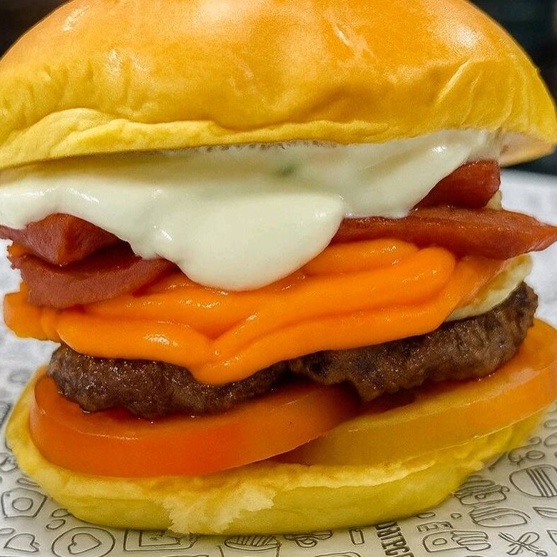 Pão de brioche,carne,ovo,queijo cheddar,calabresa,tomate e molho da casa.