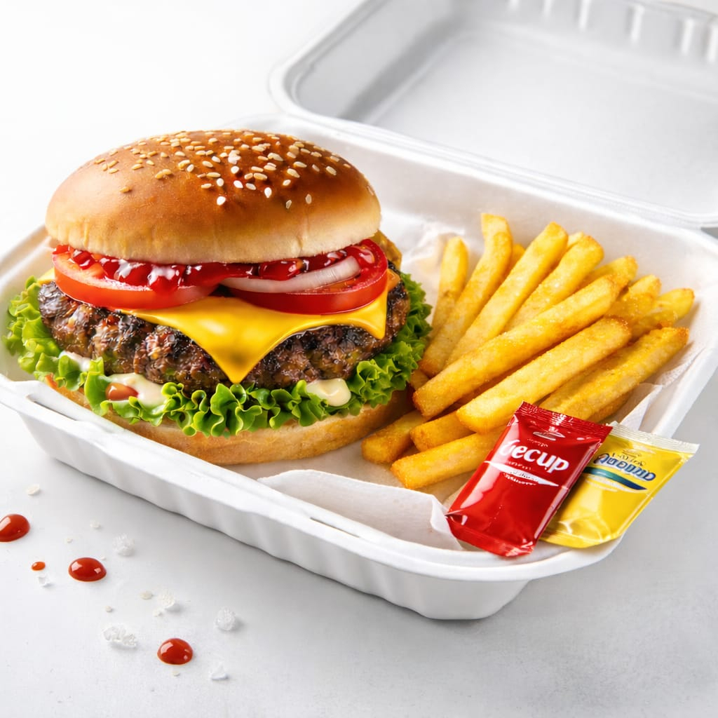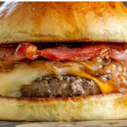 Pão, carne 150 g, queijo, salada, batata palha, batata frita