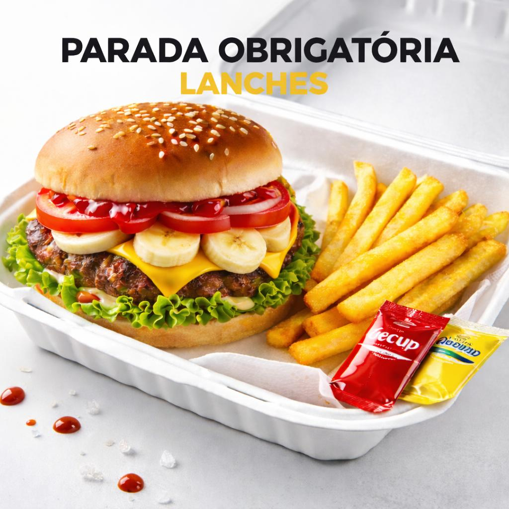 Pão, Carne 150g, Queijo, banana, batata frita, batata frita, salada e Batata Palha