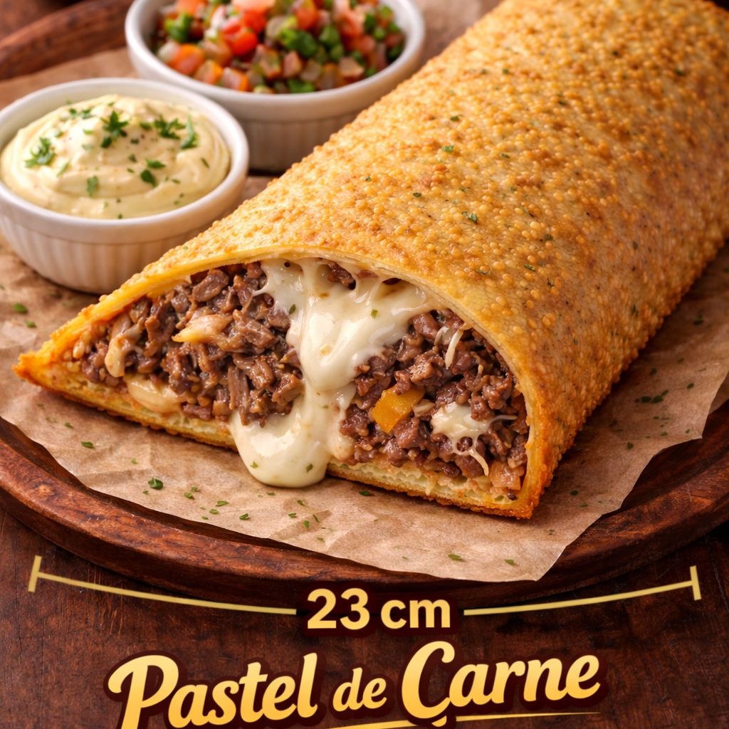 Recheio de carne bem temperada, queijo, creme cheese. + Acompanhamento vinagrete, maionese temperada.