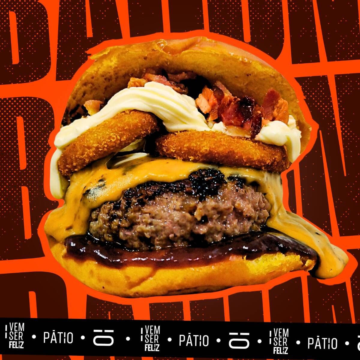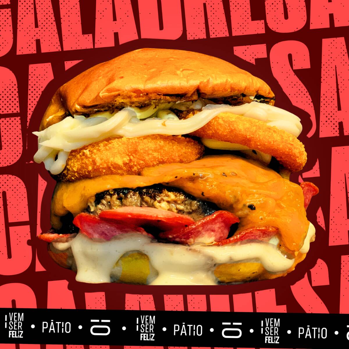 Pão Brioche, blend de 150g, dobro de queijo, fatias de calabresa, Anéis de cebola empanada, molho de maionese de alho do PÁTIO e molho Catupiry® Original.