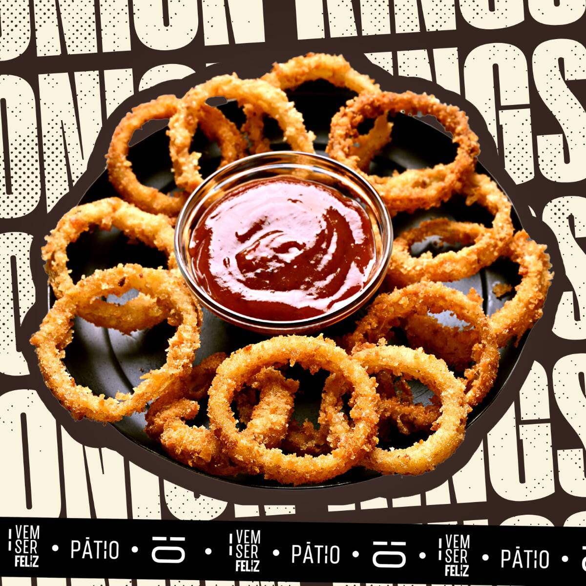 Porção M de anéis de cebola empanada com maionese de alho do Pátio ou barbecue.