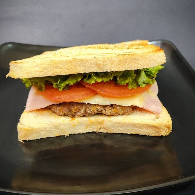 Pão de Forma, 90 g de Carne saborosa, Queijo Mussarela, Presunto e Tomate e Alface fresca, proporcionando uma experiência deliciosa.