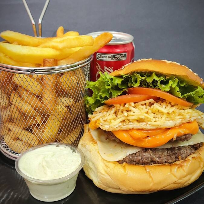 Pão, Duas Carnes de 90g, Queijo Mussarela, Queijo Cheddar, Ovo, Batata Palha e Salada