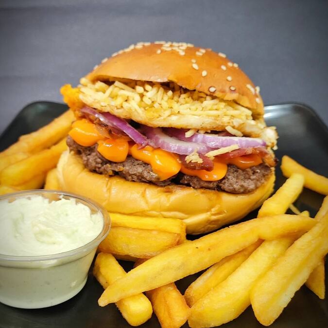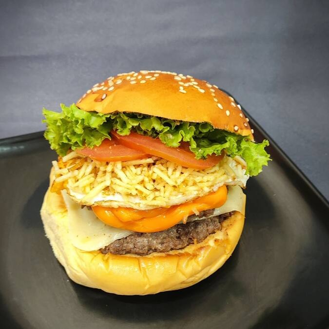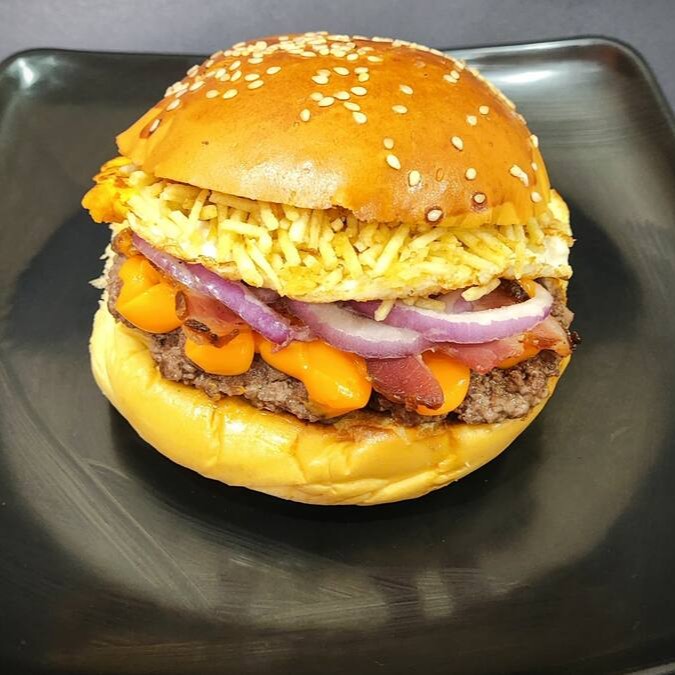 Pão de hambúrguer, 120 g de Carne, Queijo Cheddar, Bacon, Ovo, Cebola Roxa e Batata Palha.