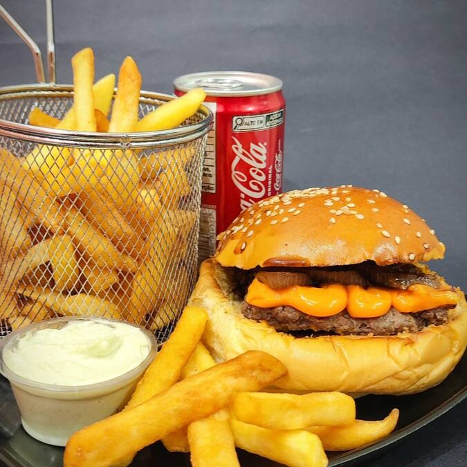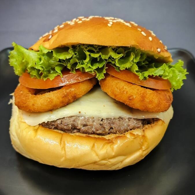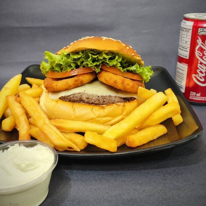 Pão de hambúrguer, 90g de carne, queijo Mussarela, Cebola empanada, Tomate e Alface