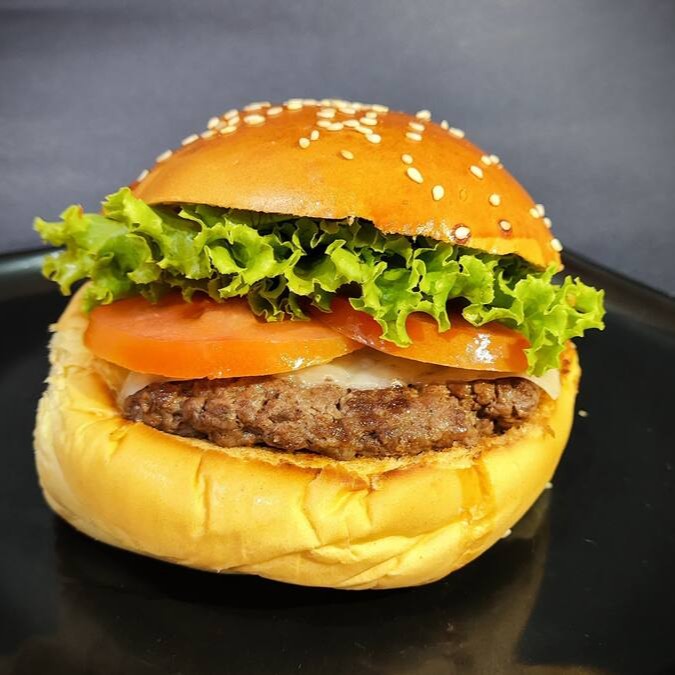 Pão de hambúrguer, 90 g de carne suculenta, Queijo Mussarela, Tomate e Alface