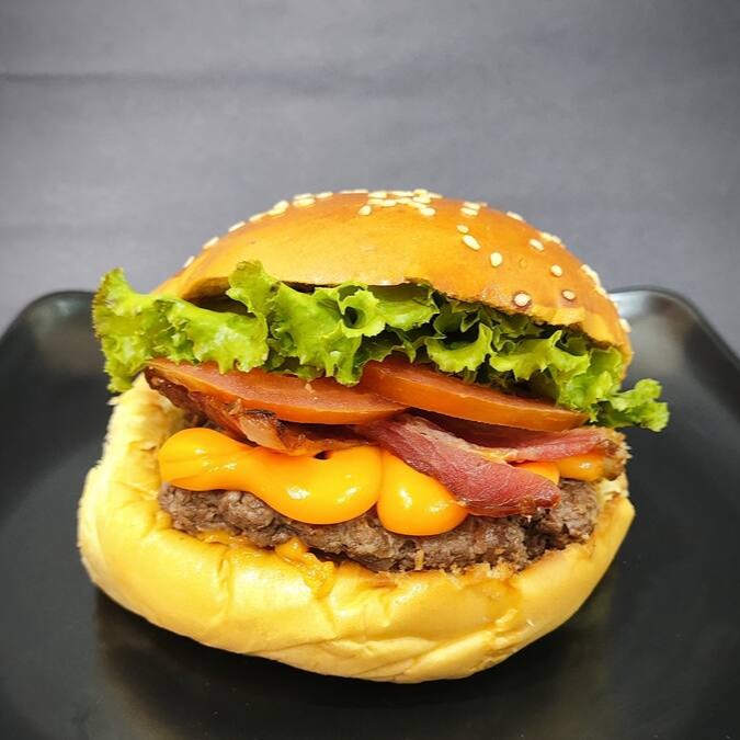 Pão de hambúrguer, 90g Carne, Queijo Cheddar, Bacon e Tomate e Alface