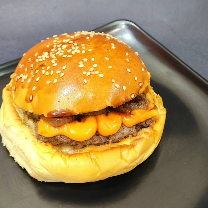 Pão de hambúrguer, 90 g de Carne, Queijo cheddar em Dobro e Cebola Caramelizada