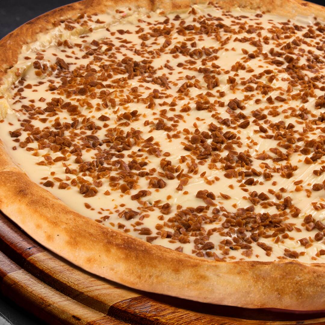 Para os amantes de chocolate! Creme de leite com generosas porções de chocolate ao leite derretido sobre uma massa de pizza macia e fofa. Simplesmente irresistível!