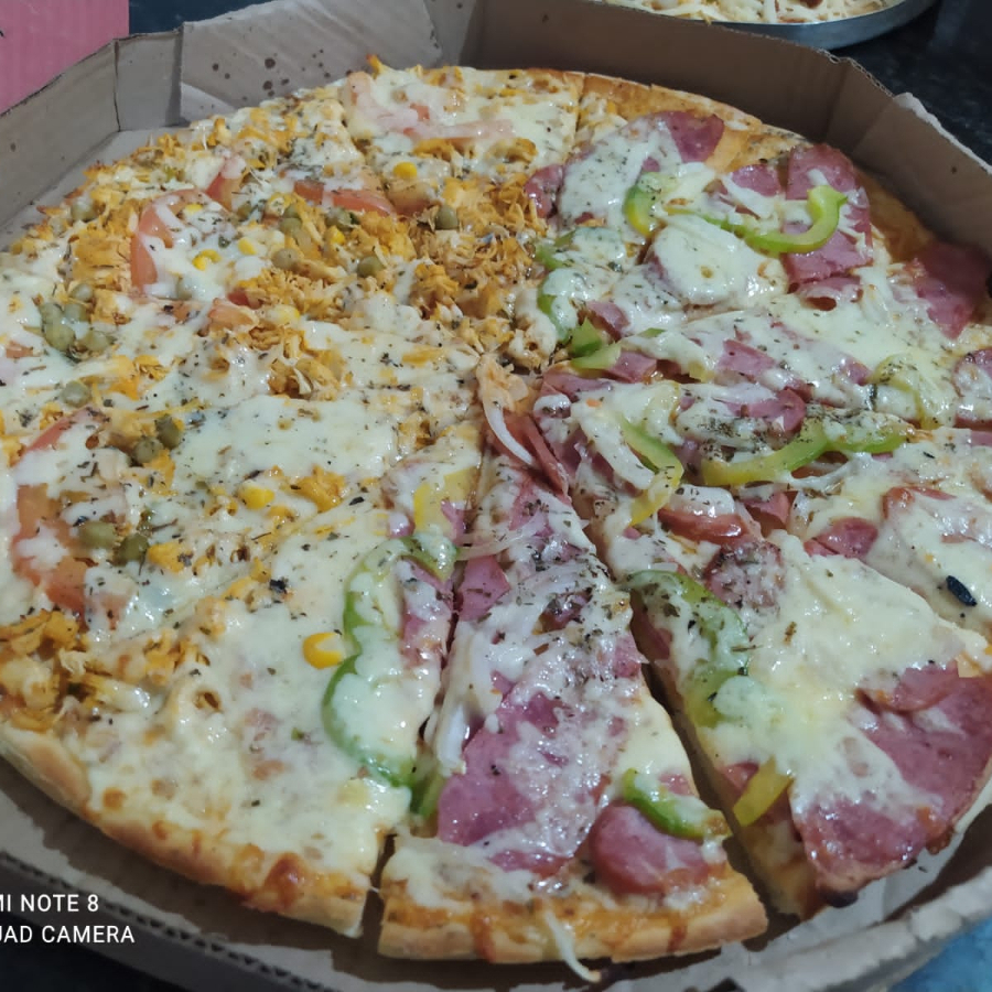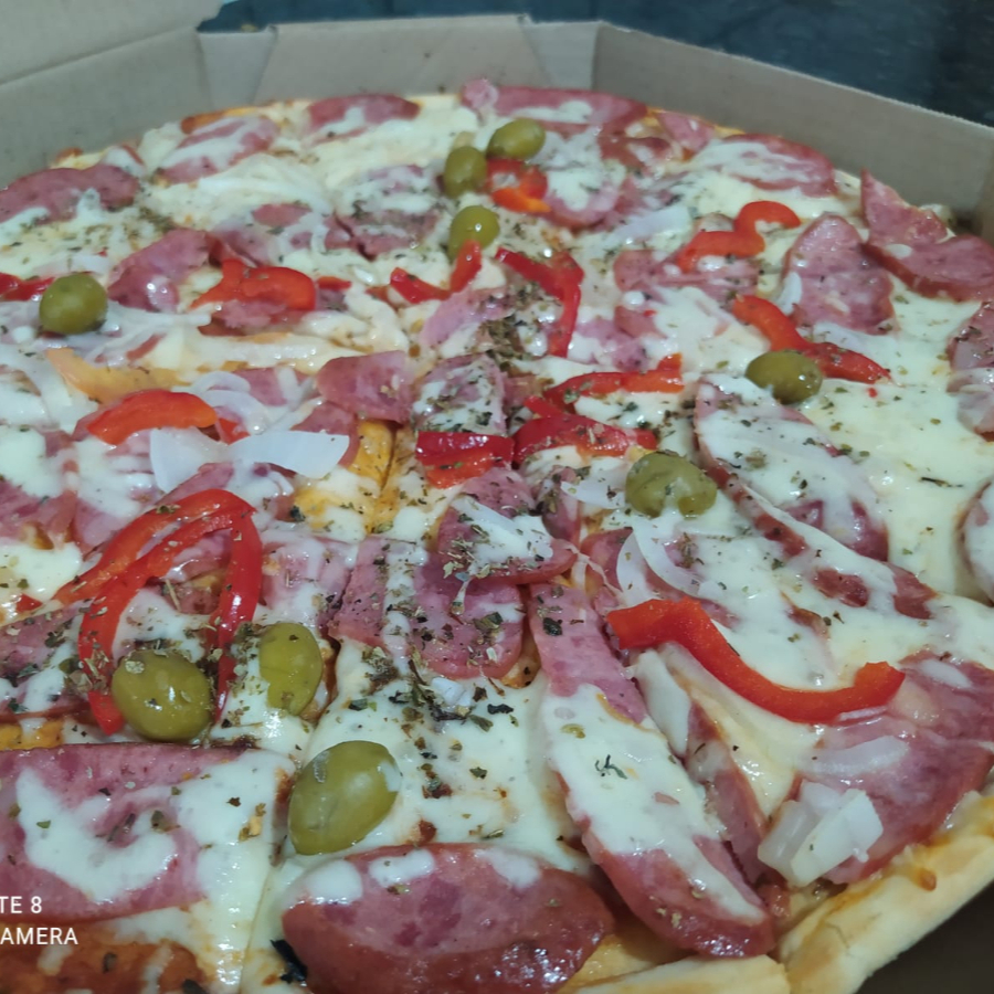 Molho, Mussarela, Calabresa, Frango, Presunto, Pimentão, Ovo, Palmito, Tomante, Milho Verde, Ervilha, Azeitona e Orégano