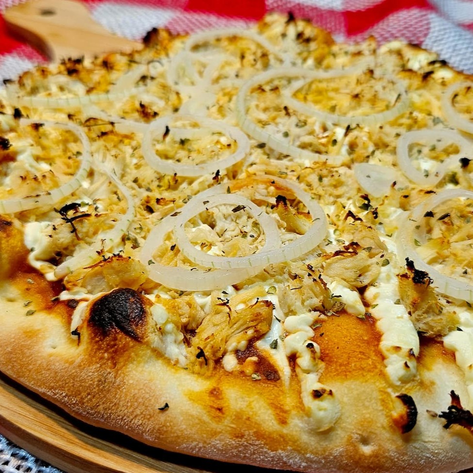 Molho de tomate, cream chesse Philadelphia cremoso, frango desfiado, cebola e orégano.