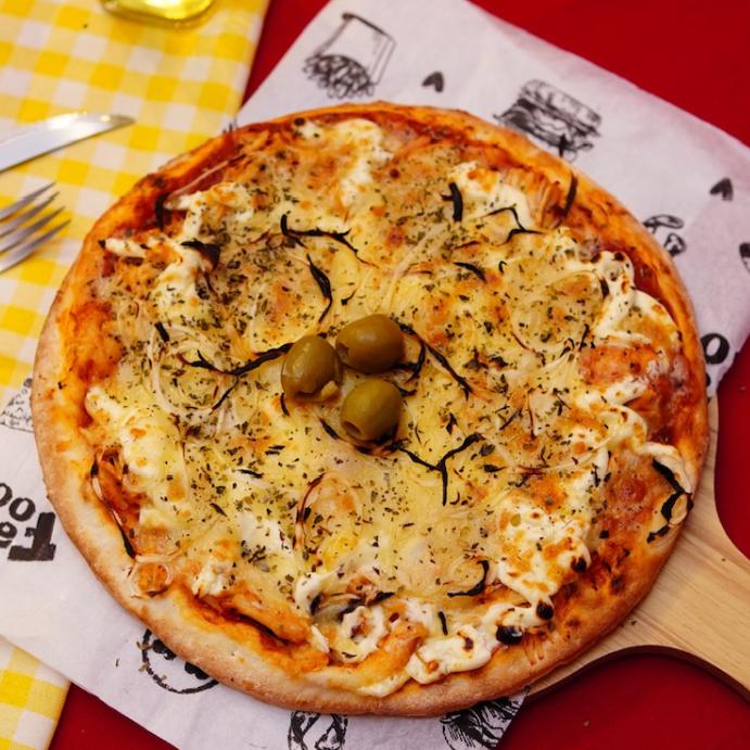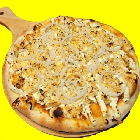 Pizza com Molho de tomate artesanal, frango desfiado, Catupiry Original, queijo mussarela, cebola, azeitona e orégano.