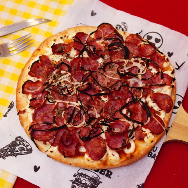 Molho de tomate, cream chesse Philadelphia cremoso, calabresa fatiada, cebola e orégano.