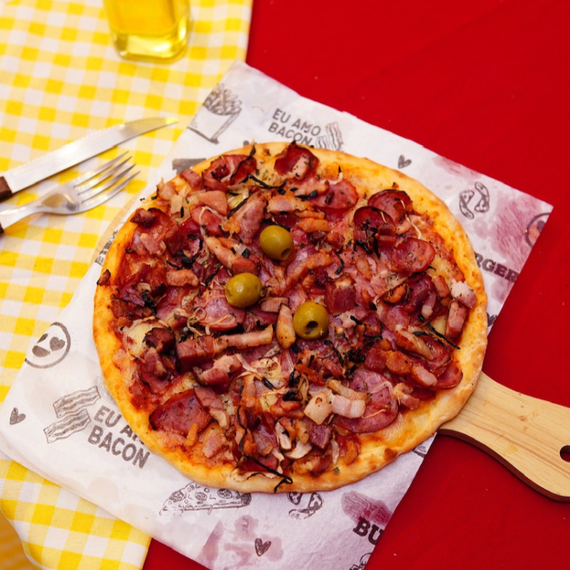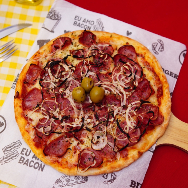 Pizza com Molho de tomate artesanal, queijo mussarela, calabresa fatiada, bacon crocante, cebola azeitona e orégano.