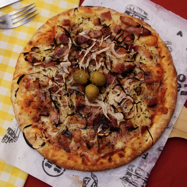 Pizza com Molho de tomate artesanal, queijo mussarela, bacon crocante, cebola, azeitona e orégano.